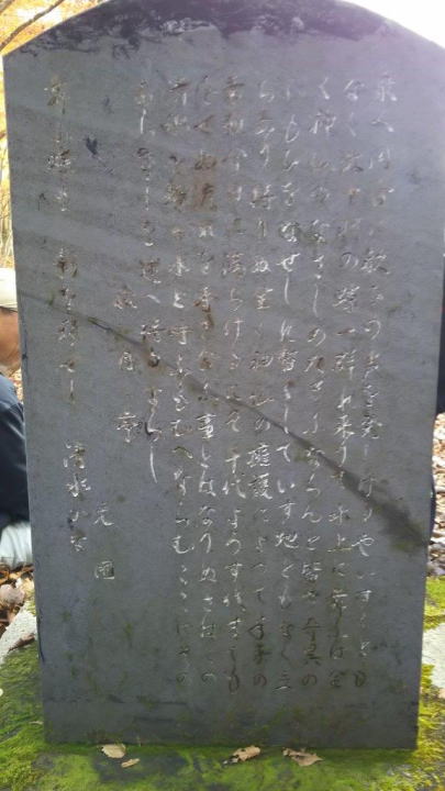 句碑には3首の俳句が刻まれ、上記俳句ではありませんがうち一つは松尾芭蕉の流れを汲む山本友左坊という俳人の手によるものとのことです。現在ある句碑は2代目です。初代の句碑は昭和と平成の移り変わりの頃に盗難にあいましたが、幸いにも拓本が残されていたことから、この拓本を元に関係者の快諾を得て、平成12年に再建されたものが現在の句碑です。